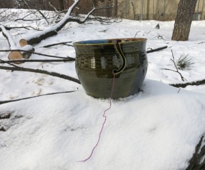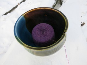 Now what is a yarn bowl, you may ask? Simply put, it’s a vessel for holding a ball or cake of yarn to keep it from rolling away and getting tangled while it’s being worked with. Put the cake in the bowl, run the end of the yarn through the slit in the side, and there you have it.